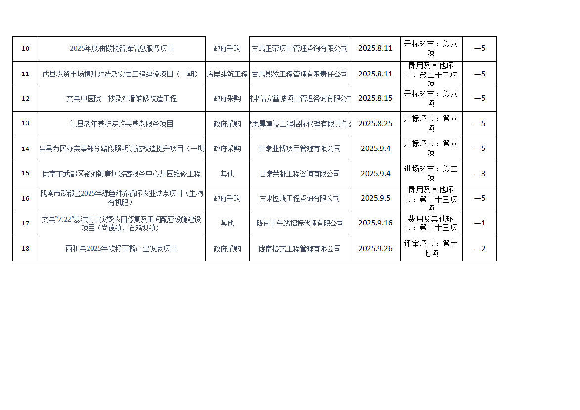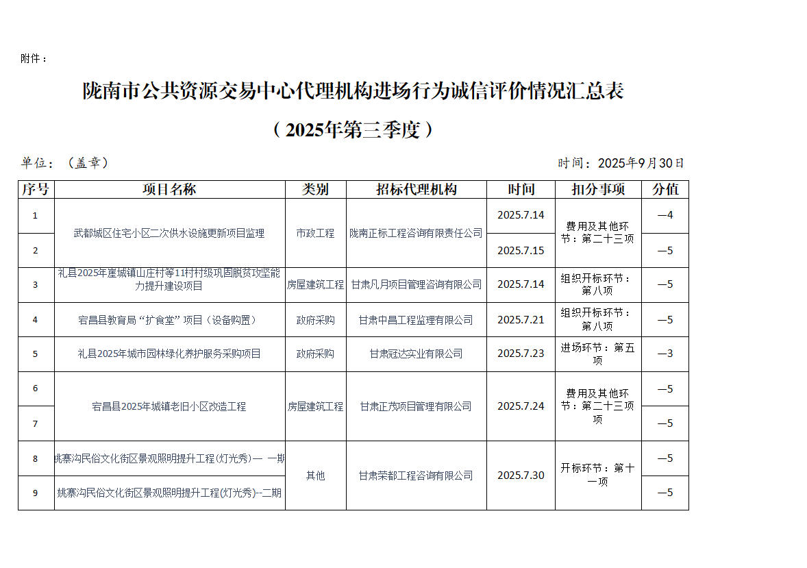 根据《陇南市公共资源交易中心代理机构进场行为诚信评价实施制度(试行)》规定,现对2025年第三季度共15家代理机构18条进场行为诚信评价记录予以通报(详见附表)。请各代理机构严格遵守各项规章制度、诚实守信,规范操作,为招标人和采购人提供专业、高效、规范的招标代理服务。