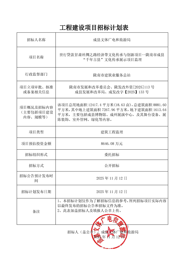 工程建设项目招标计划表世行贷款甘肃丝绸之路经济带文化传承与创新项目--陇南市成县“千年古县”文化传承展示项目监理.pdf