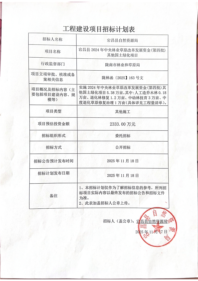 宕昌县2024年中央林业草原改革发展资金(第四批)其他国土绿化项目