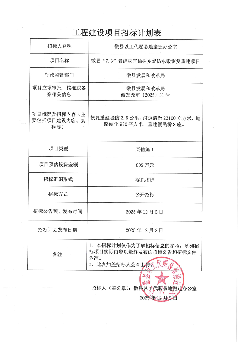 徽县“7.3”暴洪灾害榆树乡堤防水毁恢复重建项目