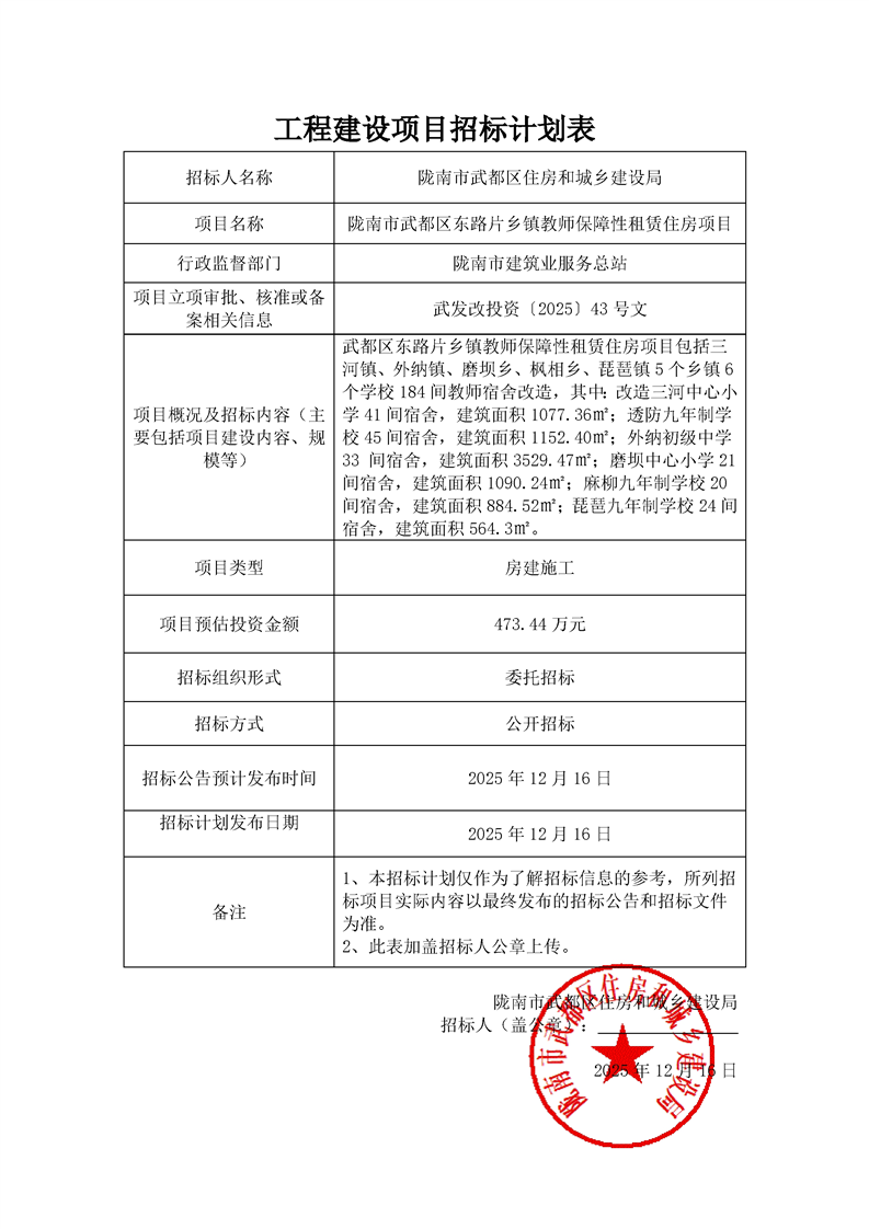 陇南市武都区东路片乡镇教师保障性租赁住房项目