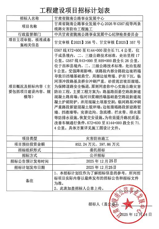 甘肃省陇南公路事业发展中心2026年G567线等两条线路灾害防治工程施工