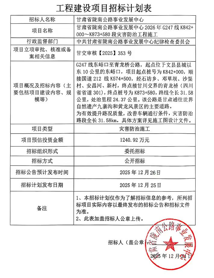 甘肃省陇南公路事业发展中心2026年G247线K842+000~K873+580段灾害防治工程施工