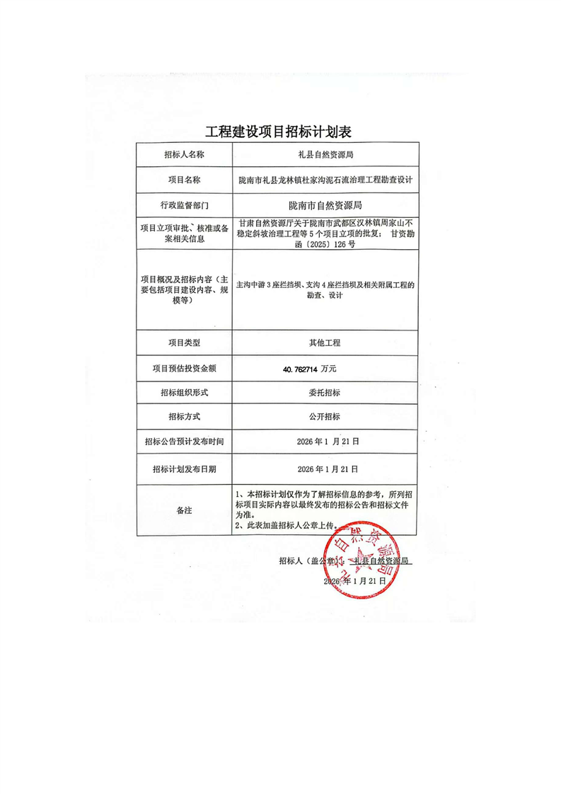 陇南市礼县龙林镇杜家沟泥石流治理工程勘查设计