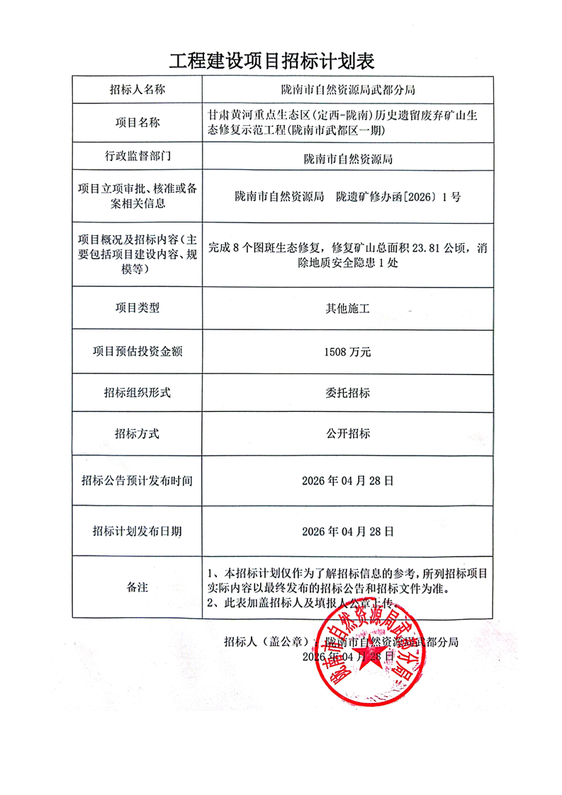 甘肃黄河重点生态区(定西-陇南)历史遗留废弃矿山生态修复示范工程(陇南市武都区一期)