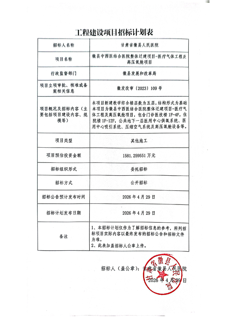 徽县中西医结合医院整体迁建项目-医疗气体工程及高压氧舱项目