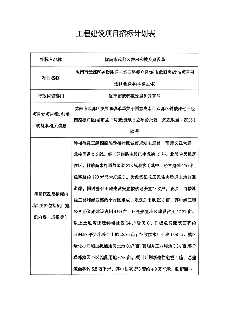 陇南市武都区钟楼滩经三经四路棚户区(城市危旧房)改造项目引进社会资本(承接主体)