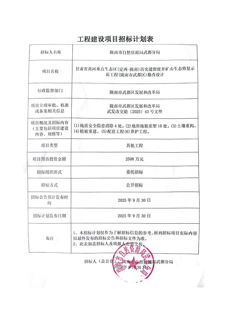 甘肃省黄河重点生态区(定西-陇南)历史遗留废弃矿山生态修复示范工程(陇南市武都区)勘查设计