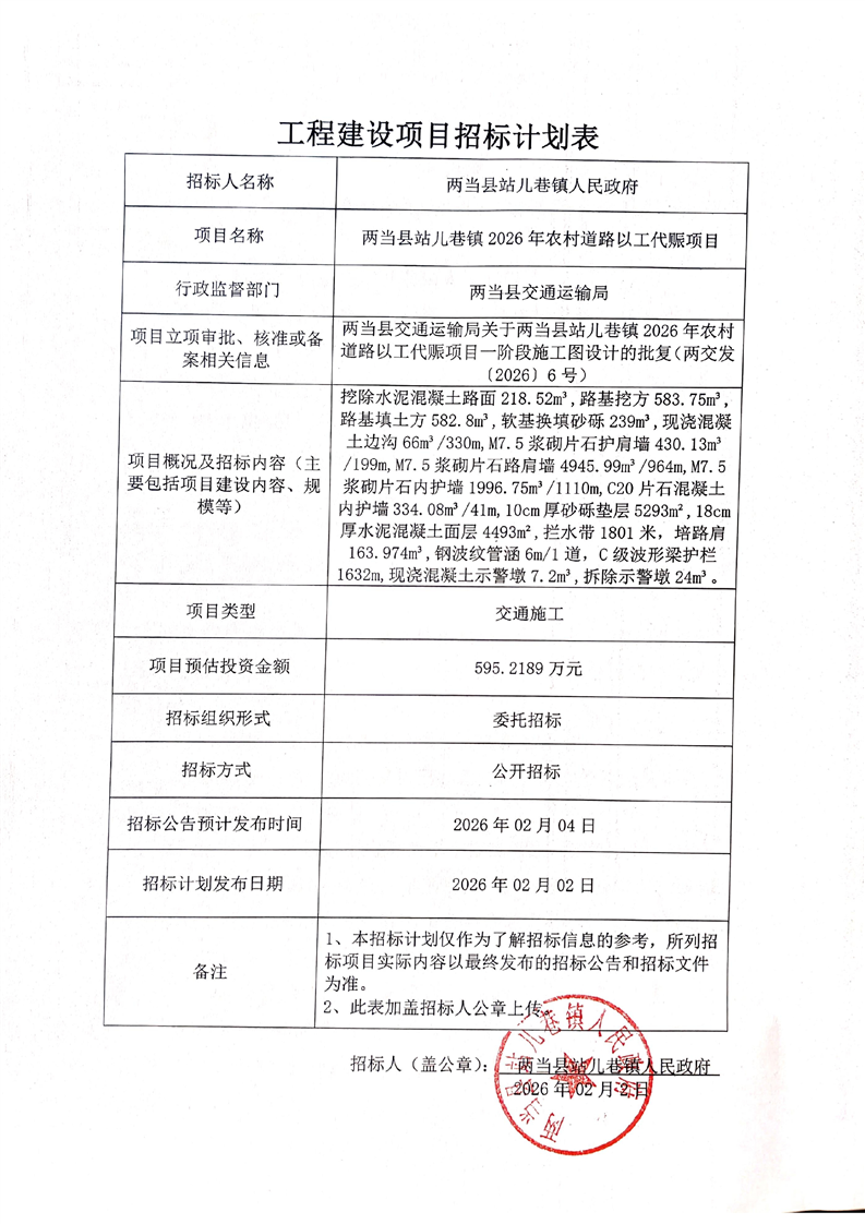 两当县站儿巷镇2026年农村道路以工代赈项目