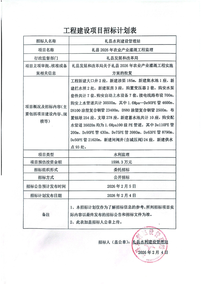 礼县2026年农业产业灌溉工程监理