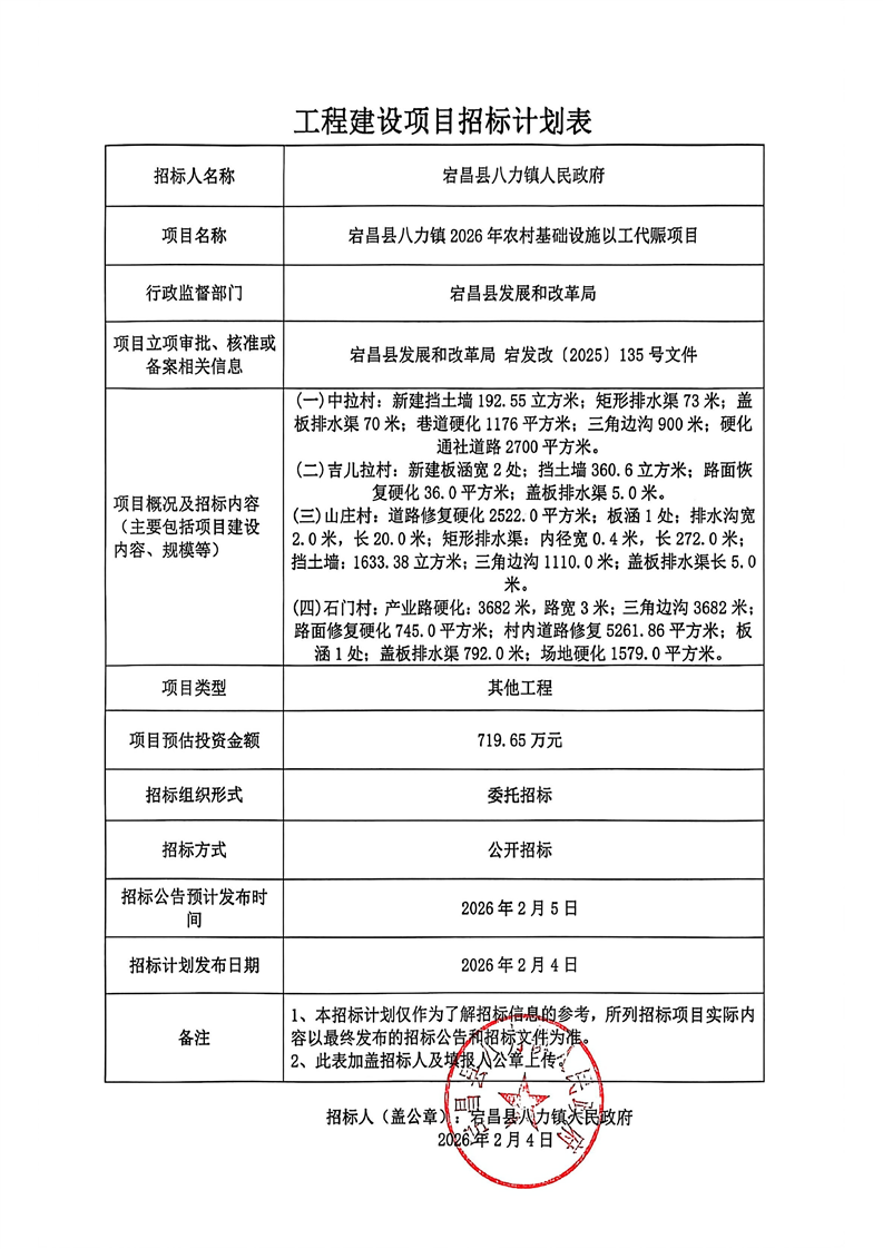 宕昌县八力镇2026年农村基础设施以工代赈项目