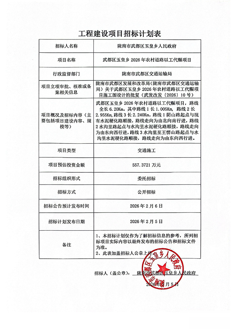 武都区玉皇乡2026年农村道路以工代赈项目