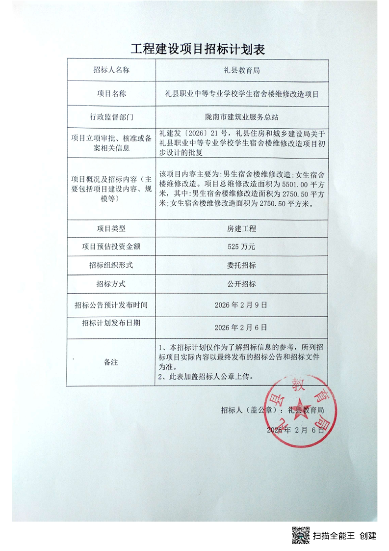 礼县职业中等专业学校学生宿舍楼维修改造项目