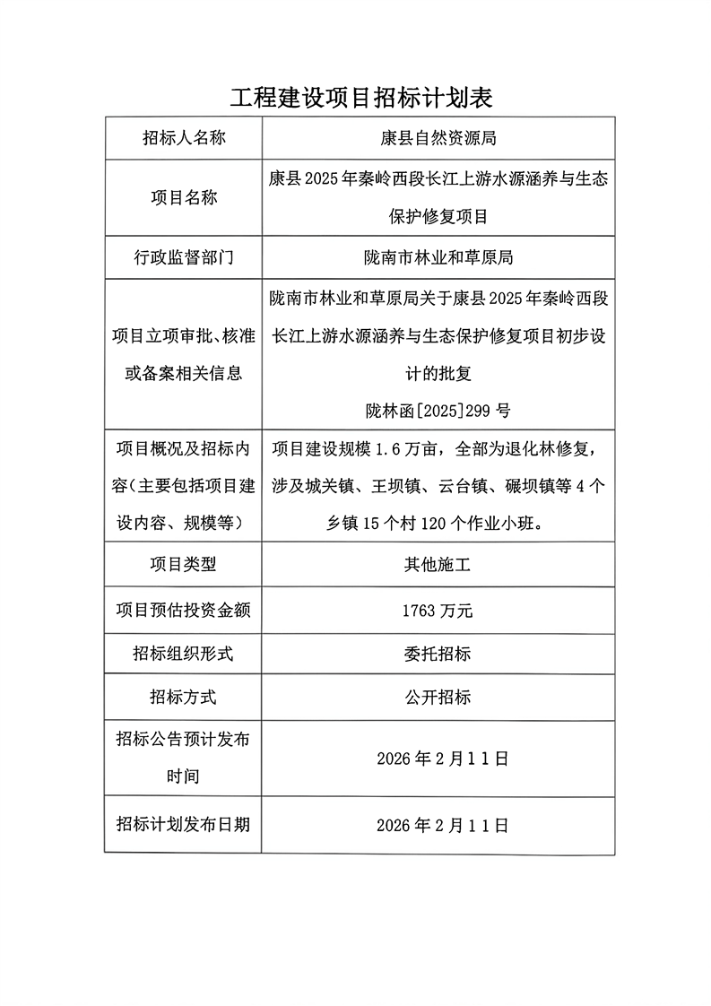 康县2025年秦岭西段长江上游水源涵养与生态保护修复项目