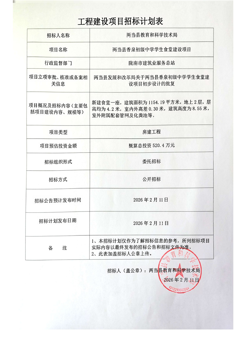 两当县香泉初级中学学生食堂建设项目