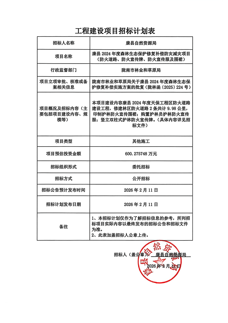 康县2024年度森林生态保护修复补偿防灾减灾项目(防火道路、防火宣传牌、防火宣传服及围裙)