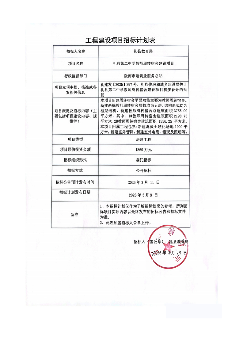 礼县第二中学教师周转宿舍建设项目