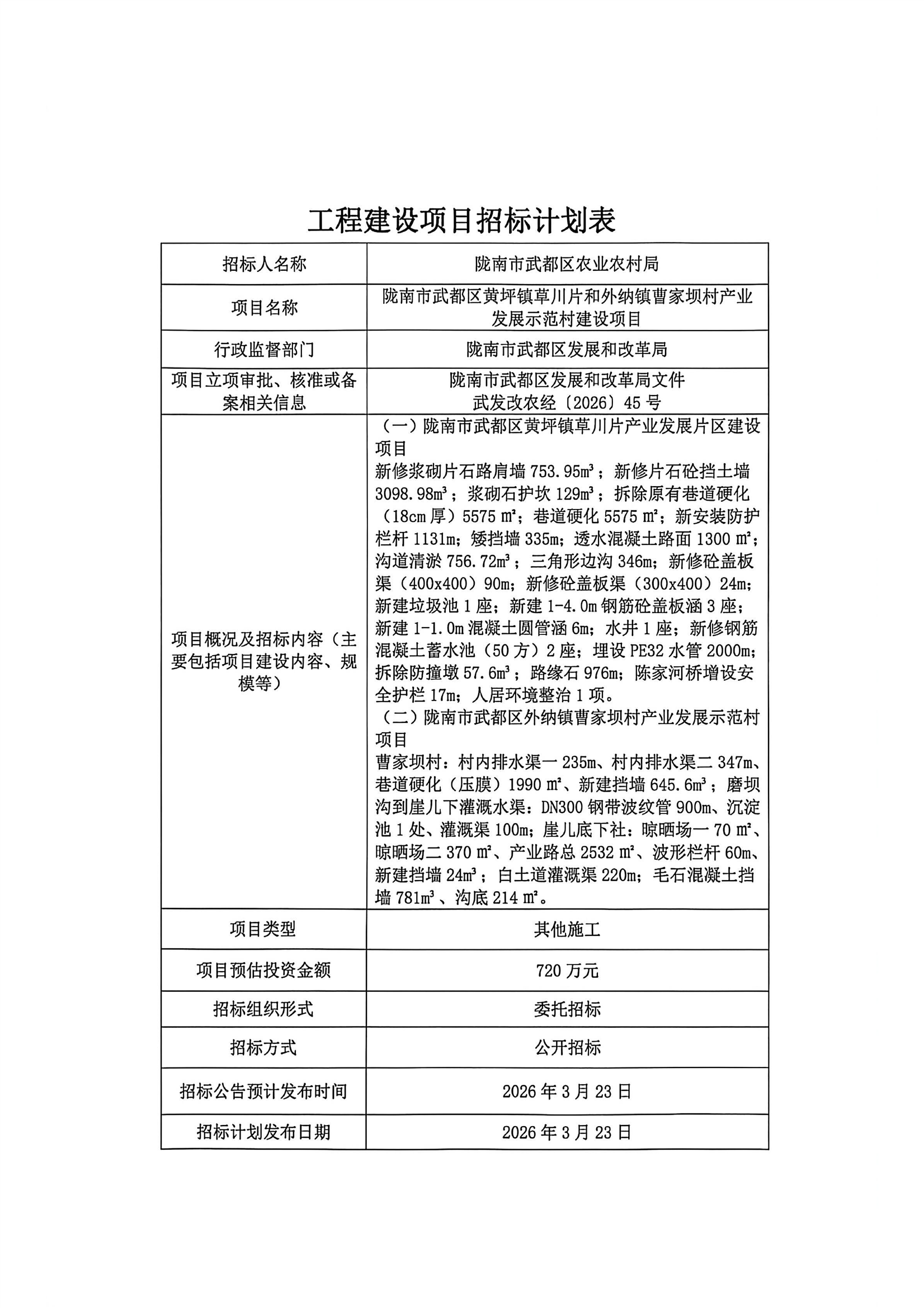 陇南市武都区黄坪镇草川片和外纳镇曹家坝村产业发展示范村建设项目