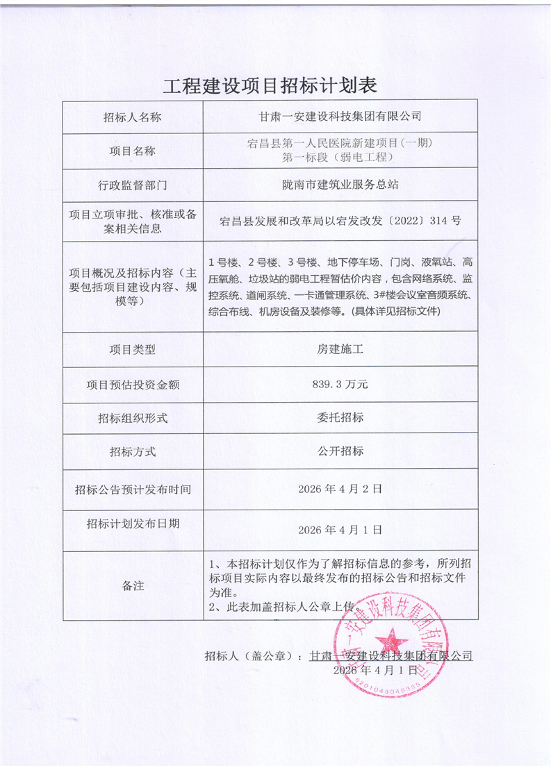 宕昌县第一人民医院新建项目(一期)第一标段(弱电工程)