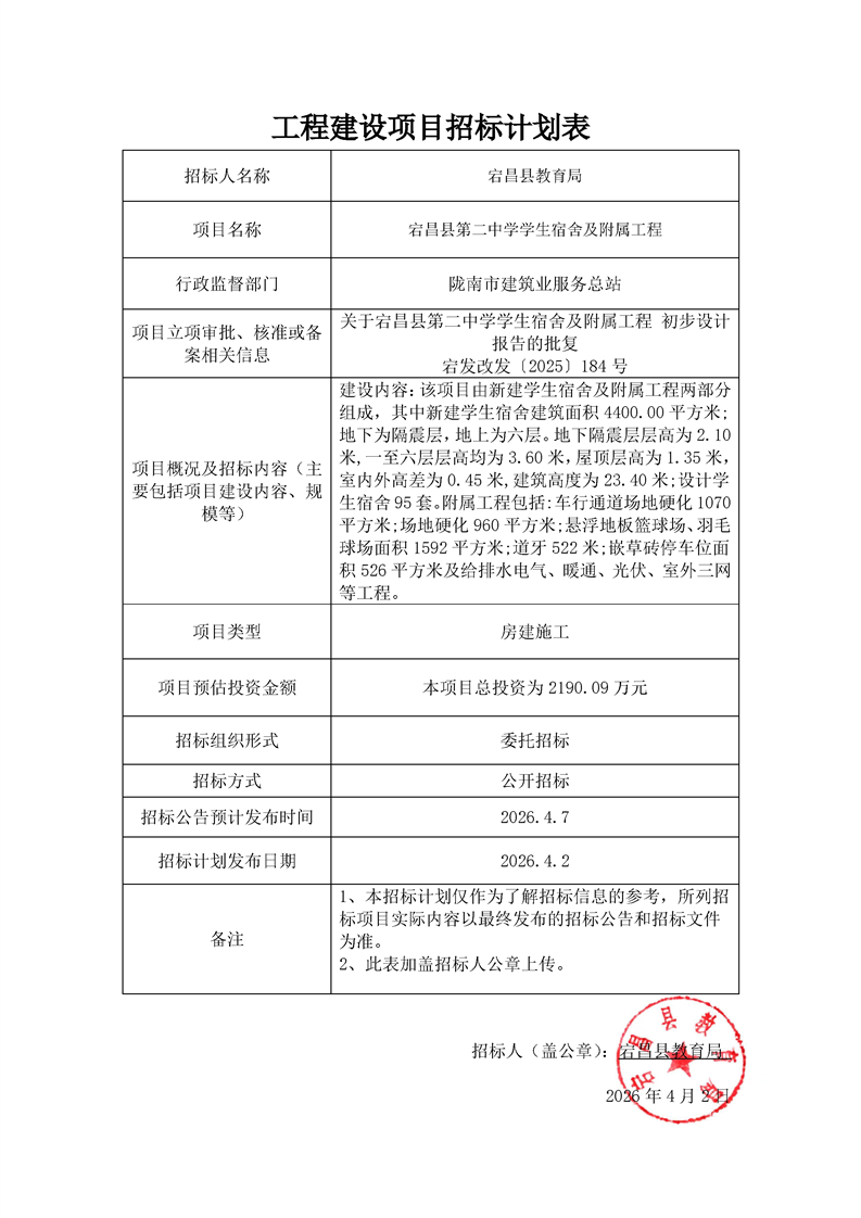 宕昌县第二中学学生宿舍及附属工程【工程建设项目招标计划表】.pdf