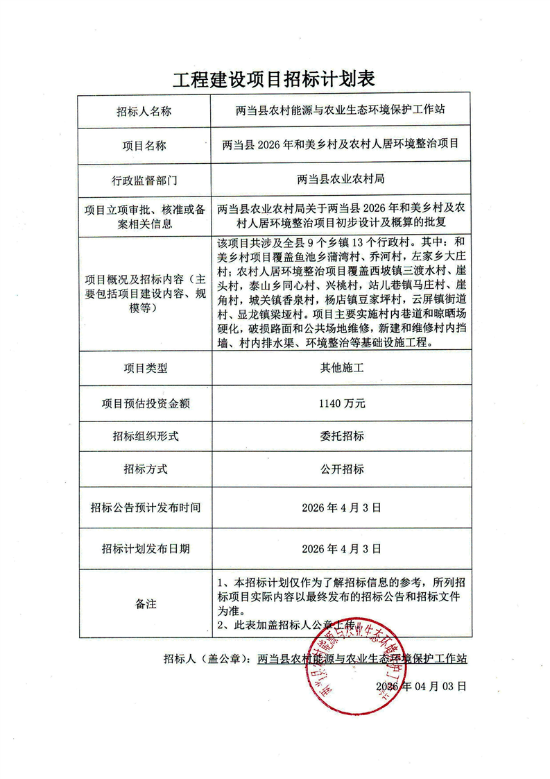 两当县2026年和美乡村及农村人居环境整治项目