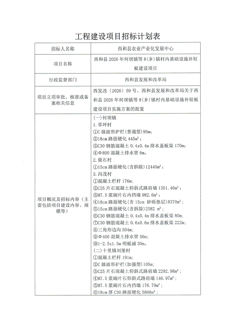 西和县2026年何坝镇等8(乡)镇村内基础设施补短板建设项目