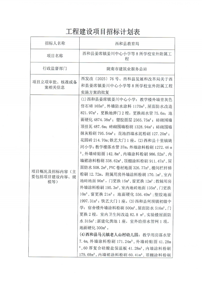 西和县姜席镇姜川中心小学等8所学校室外附属工程