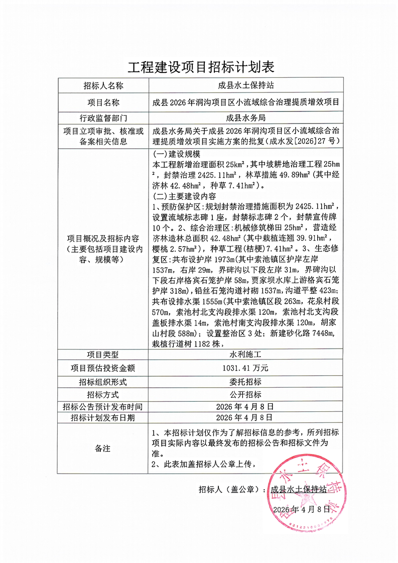 成县2026年洞沟项目区小流域综合治理提质增效项目