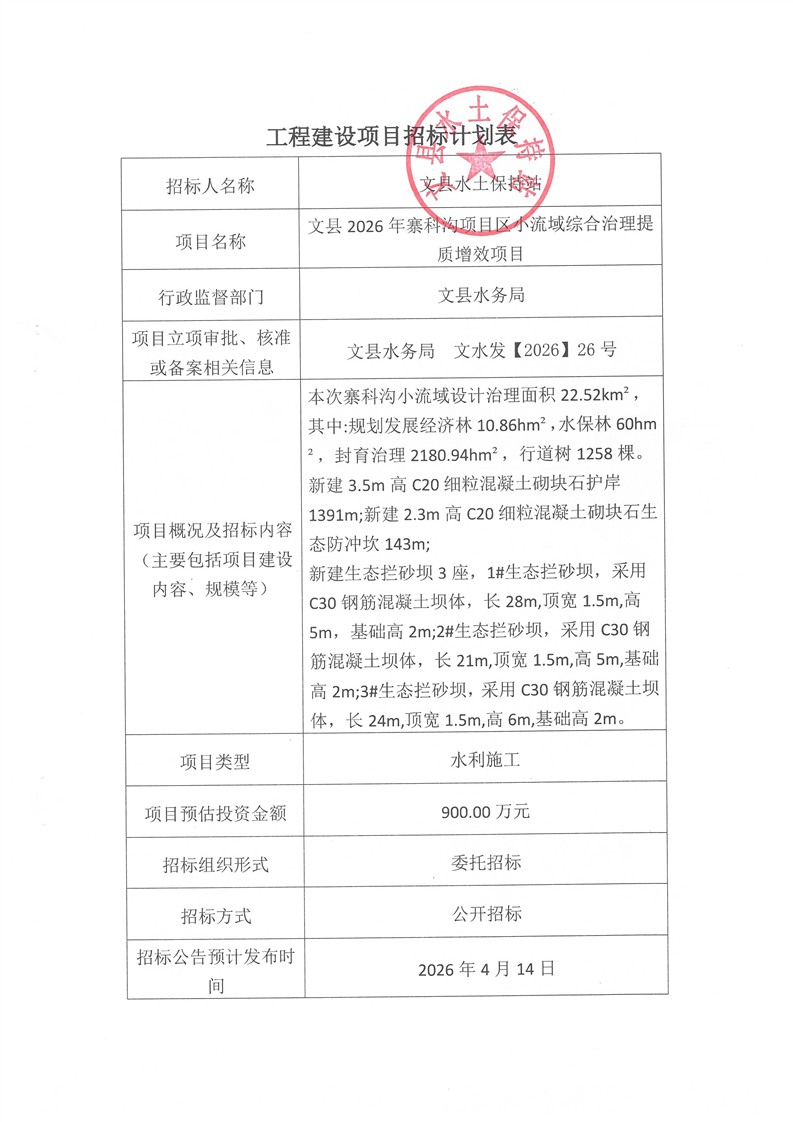 文县2026年寨科沟项目区小流域综合治理提质增效项目