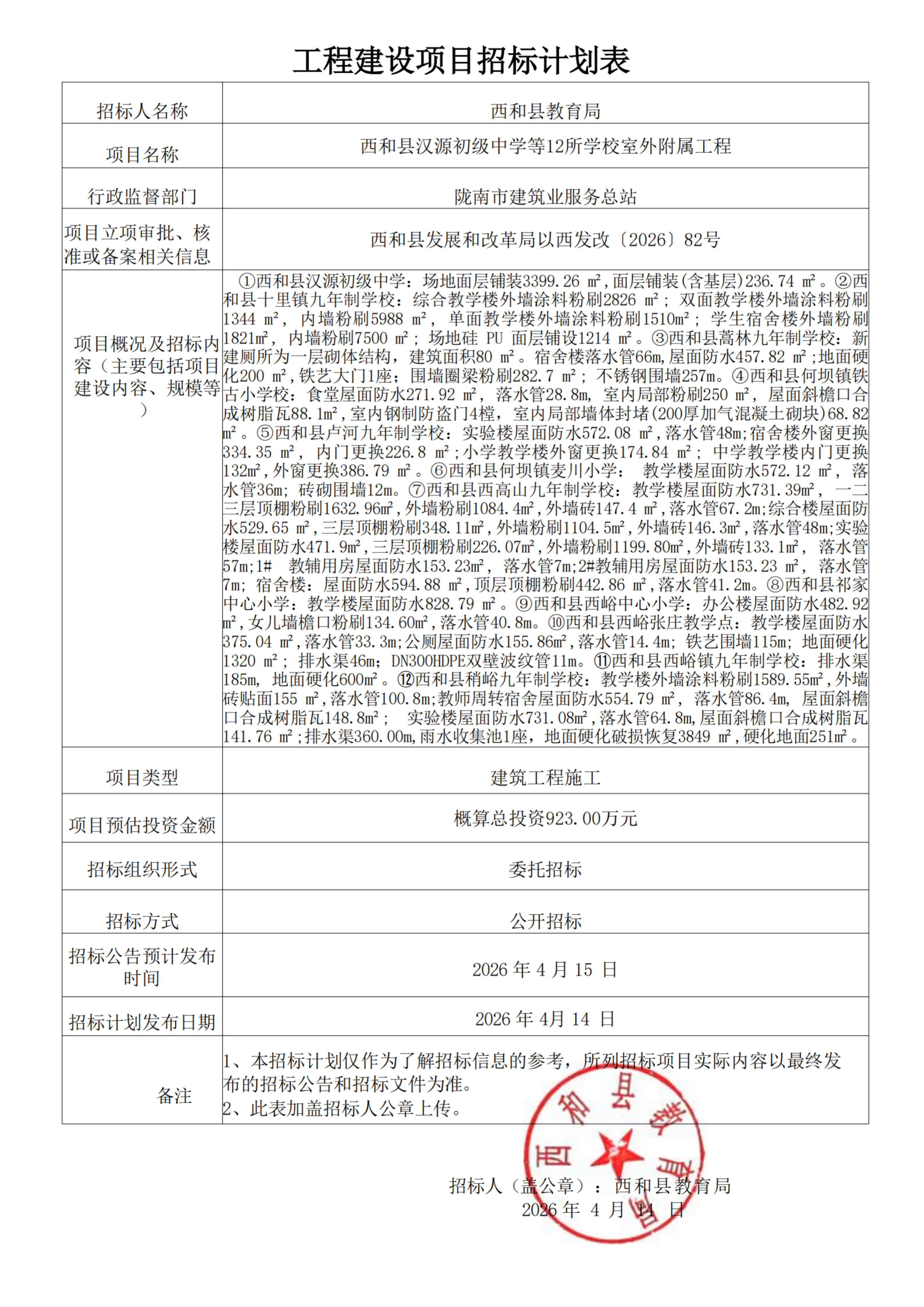 西和县汉源初级中学等12所学校室外附属工程