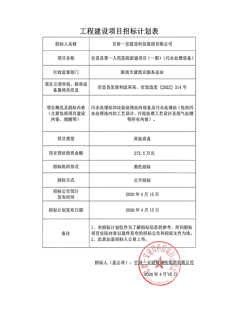 宕昌县第一人民医院新建项目(一期)(污水处理设备)