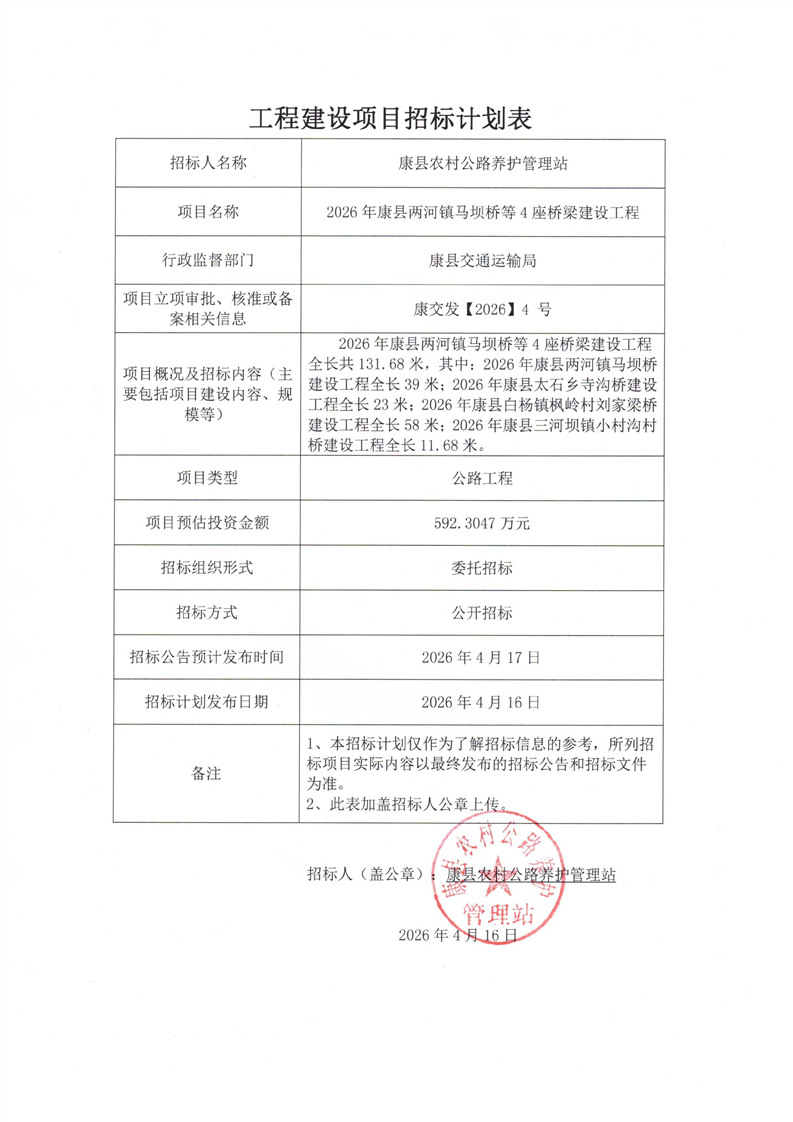2026年康县两河镇马坝桥等4座桥梁建设工程