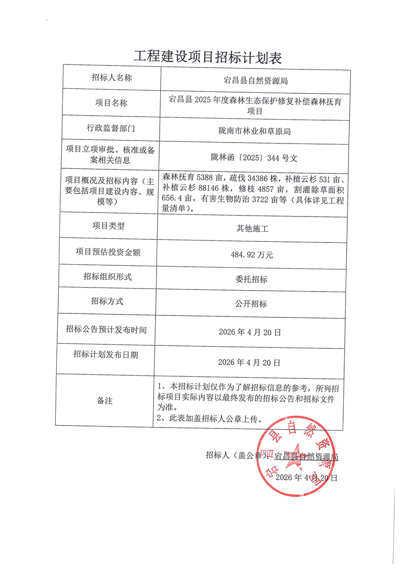 宕昌县2025年度森林生态保护修复补偿森林抚育项目