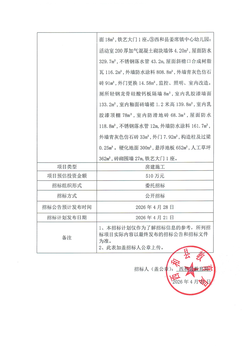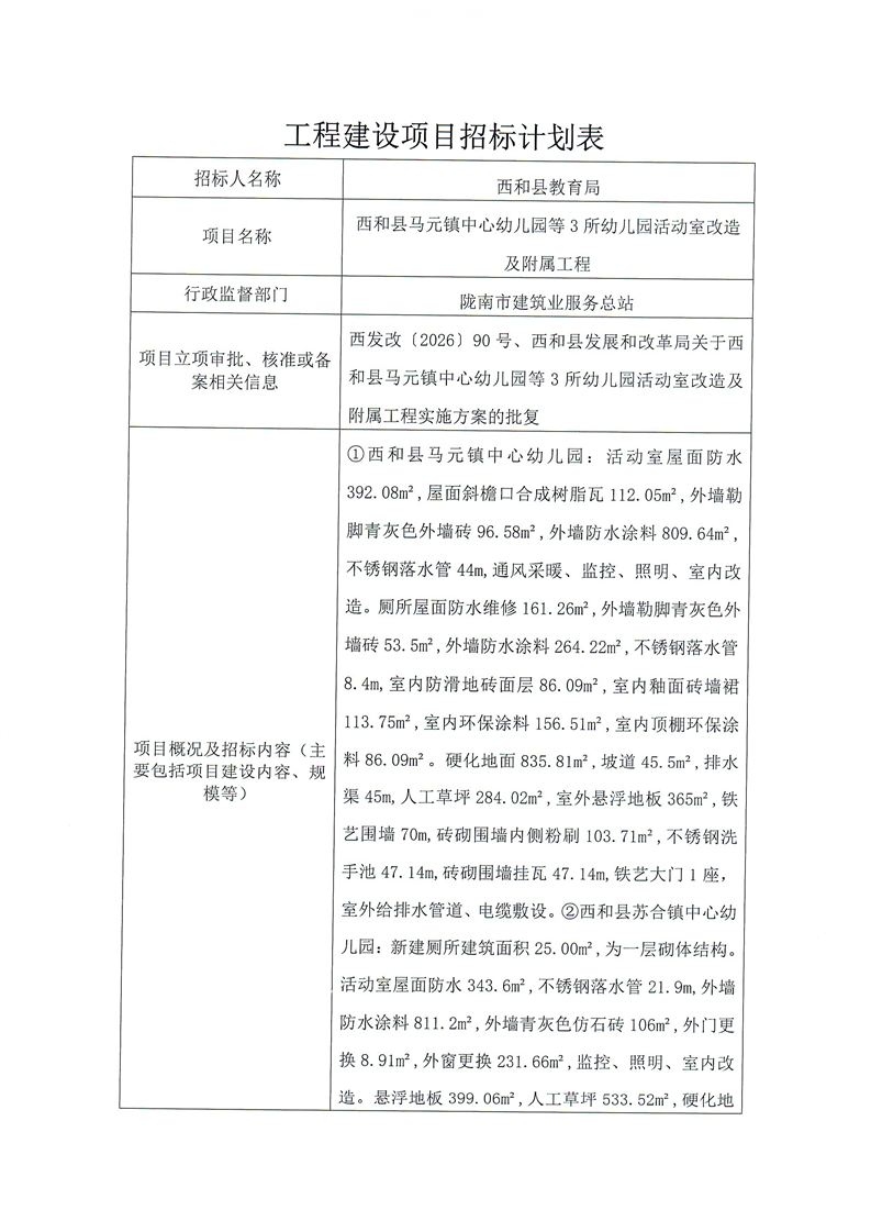 西和县马元镇中心幼儿园等3所幼儿园活动室改造及附属工程