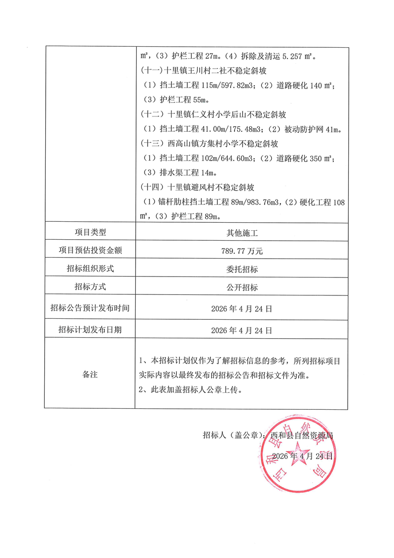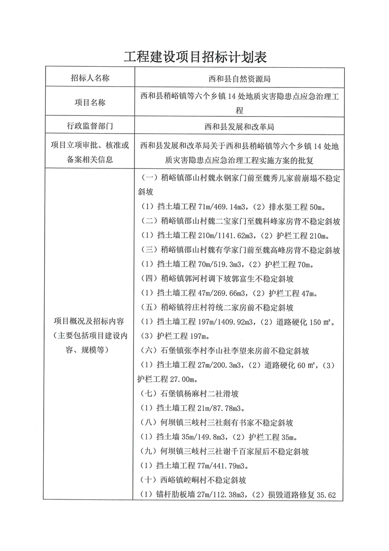 西和县稍峪镇等六个乡镇14处地质灾害隐患点应急治理工程